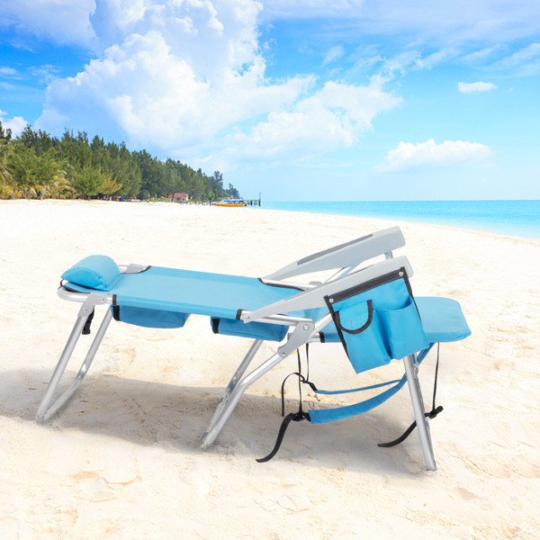 Get comfortable with this Folding beach Chair. It is an ideal solution for sitting and relaxing in comfort during outdoor activities. It is also a must-have for a sporting event, a picnic, a camping trip or even just to the backyard. The aluminum frame is not only light-weight, but also offers even greater sturdiness and stability to make it stand up to various conditions. In addition, the adjustable back with 5 positions to create better sitting feeling, and the extra storage space such as pouches on the back and side cup holder allow you to keeps the necessities right by your side. The beach chair is light-weight and easy to move so that it fits easily inside most vehicles for fast transport wherever you need.