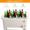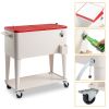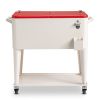 Level up your outdoor events with an all-in-one cooler cart! Fit all the cool refreshments you need with a large, 80-quart fill capacity, and the lower shelf provides extra space for extra beverages or other items you wish to store. Its insulated basin keeps your beverages cold for multiple hours with its injected molded insulation technology. The bottle opener and cap catcher help you easily remove and collect the caps, and the sturdy wheels provide easy mobility when the cooler is full with its locking casters. The drainage cap make it so convenient to clean up the cooler in a nap. Entertain yourself and your guests with this beautiful and high-quality rolling cooler cart!