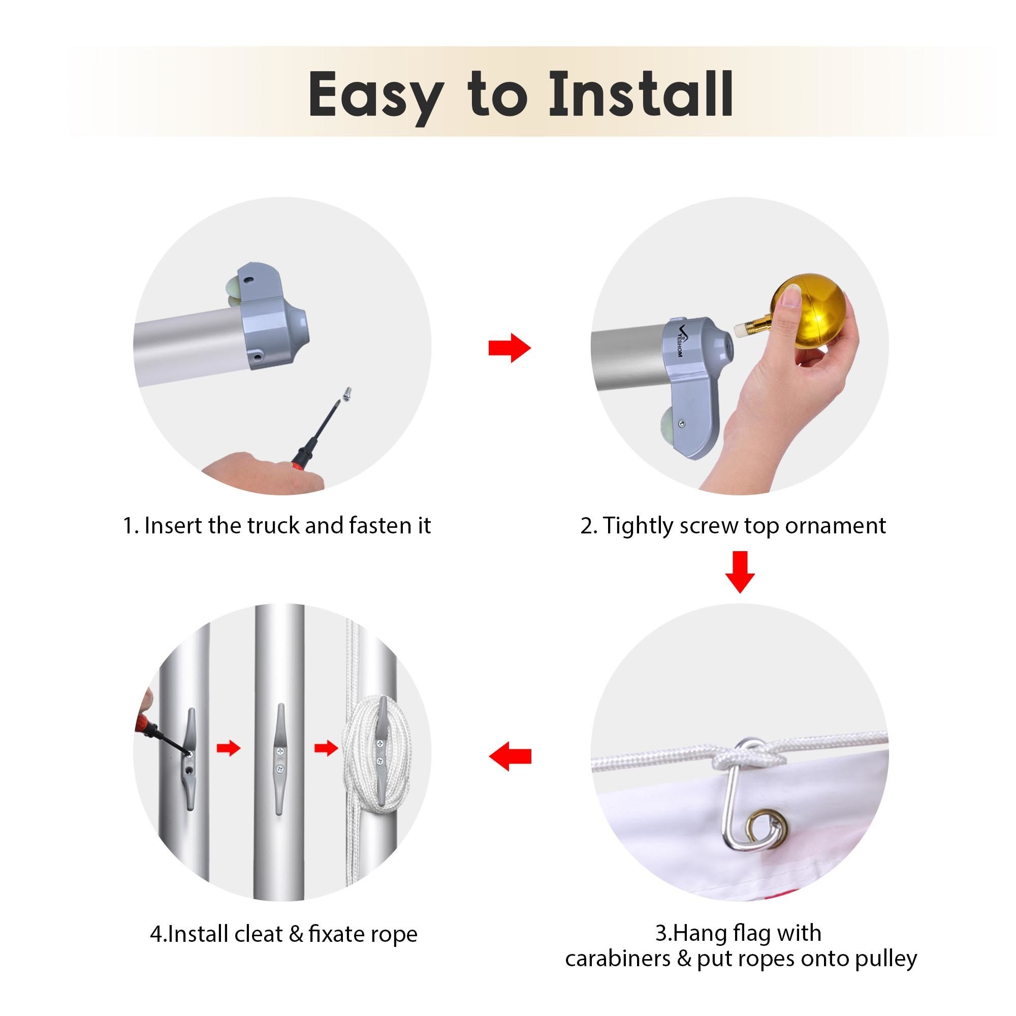 - Easy to Install - Simple and fast installation with following 4 steps: Insert the truck to flagpole and fasten it with screw; tightly screw top ornament into truck; hang flag on rope with carabiners and put ropes onto pulley; finally installing cleat and fixate rope on it