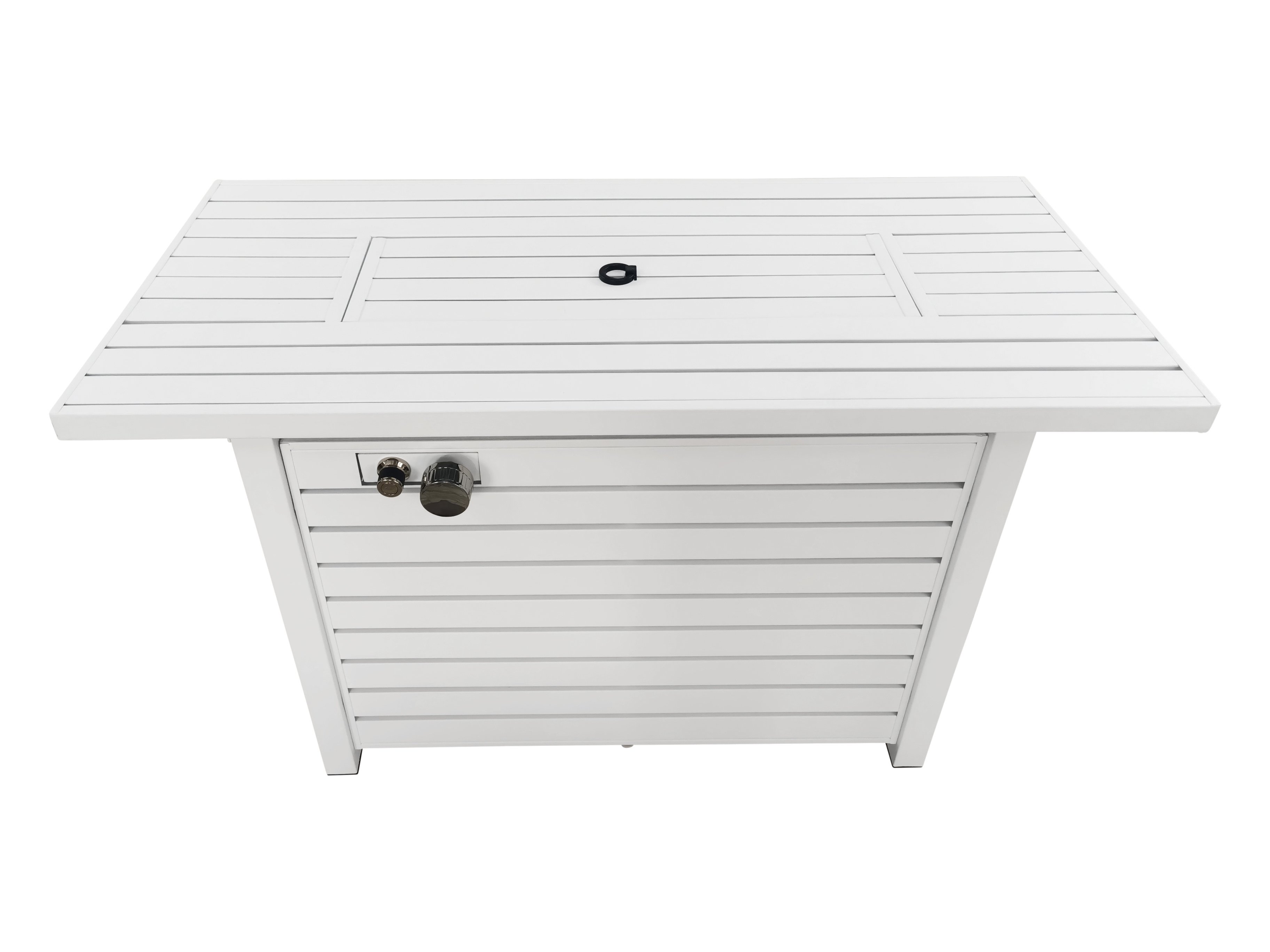 This outdoor fire pit table creates a cozy focal point in any backyard or patio space. Its a rectangular shape, with stainless steel construction in a slatted style, with a heat- and weather-resistant powder-coated finish. This fire pit is fueled by propane; it turns on with the push of a button and offers a 50000 BTU output, an adjustable flame, and an eight-hour burn time. The rectangular well in the center of this unit is filled with lava rocks. It includes batteries, as well as a protective cover. This fire pit accommodates a 20 lb. gas tank (not included)Whats Included?FillerLidCoverFeaturesThe fire pits are inbuilt with propane which can be converted to natural gas.