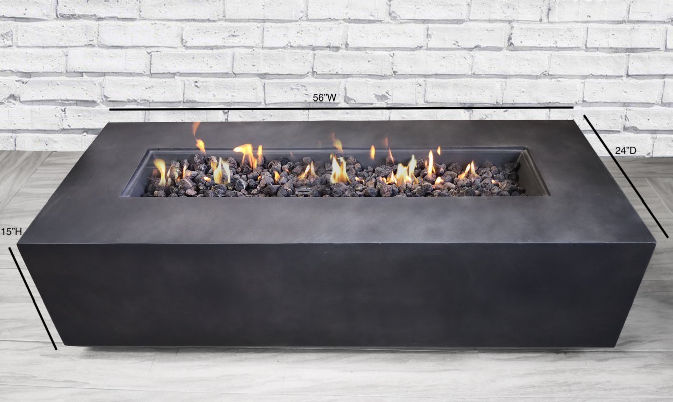 FeaturesProduct TypeFire pit tableExterior MaterialConcreteBurning Area MaterialStainless SteelPowder Coated FinishYesFuel TypePropane; Natural gasGas Conversion FeatureYesGas Conversion Kit IncludedNoBurn Time of Fuel Accommodated8 hoursAdjustable FlameYesIgnition TypePush-buttonBTU Output50000 BTUCompatible Filler TypeLava Rocks; Glass Fire BeadsFiller IncludedYesFoldableNoPortableNoCover IncludedYesSpark Screen IncludedNoLog Grate IncludedNoLocationOutdoor Use OnlyBatteries RequiredYesOverall ShapeRectangleSupplier Intended and Approved UseResidential Use; Non Residential UseProduct Size (15" H x 56" W x 24" D Size)MediumImportedYesBattery or Batteries IncludedYesCompatible Fuel Size20 lb.DurabilityRust ResistantProduct CareWipe clean with a dry clothPropane Tank LocationExternalWhat is an "integrated" vs. "external" propane tank?An external propane tank does not fit within the base of the fire pit table and is instead kept outside of the unit. An external propane tank can be left as is, or it can be hidden away with a propane tank cover, which often functions as an end table.Color (Charcoal Finish)CharcoalCover MaterialPolyesterSpecificationsSafety Listing(s)ETL Listed; UL ListedAssemblyAssembly RequiredNoInstallation RequiredYesWarrantyCommercial WarrantyYesCommercial Warranty Length1 YearProduct WarrantyYesWarranty Length1 YearFull or Limited WarrantyLimitedWarranty DetailsManufacturer Warranty
