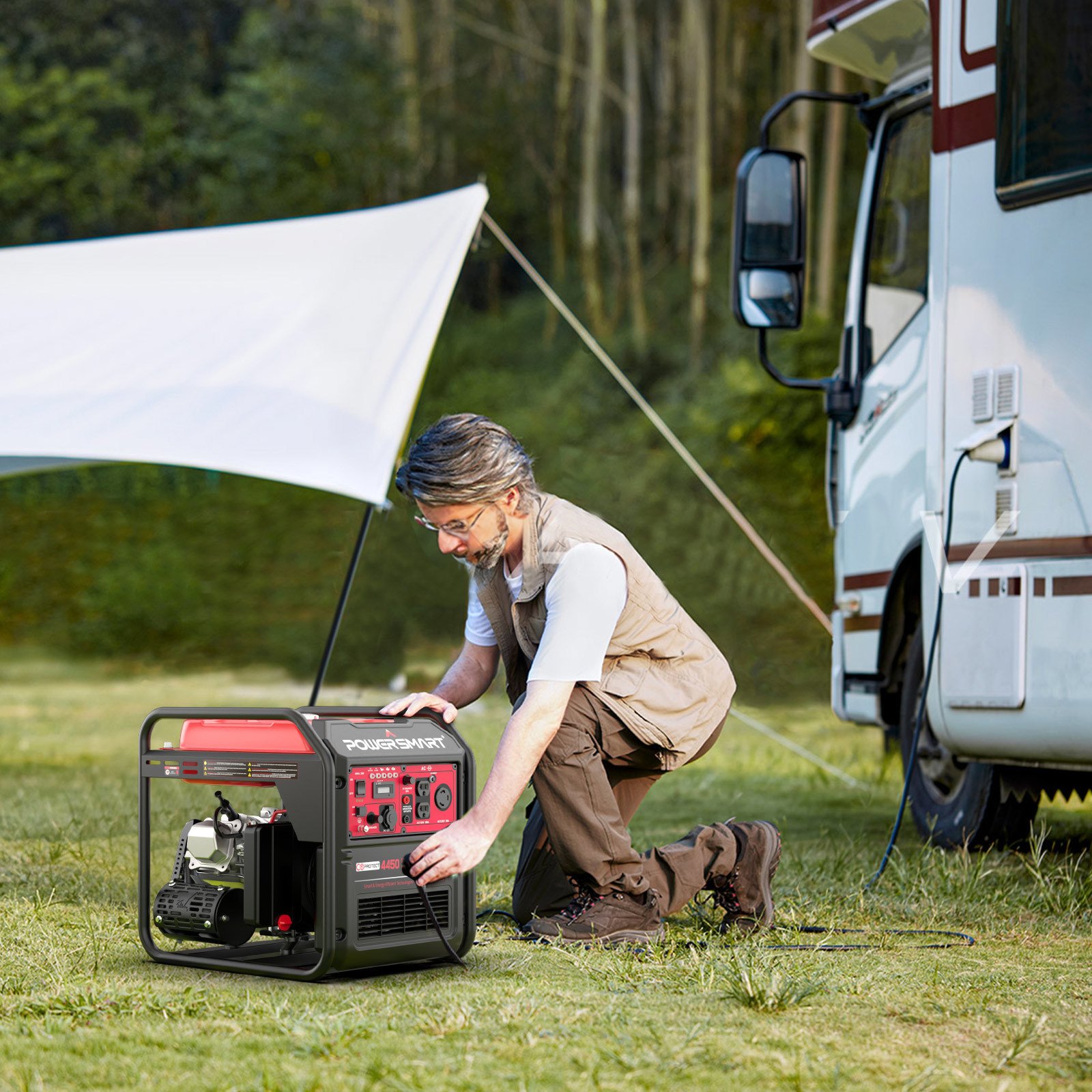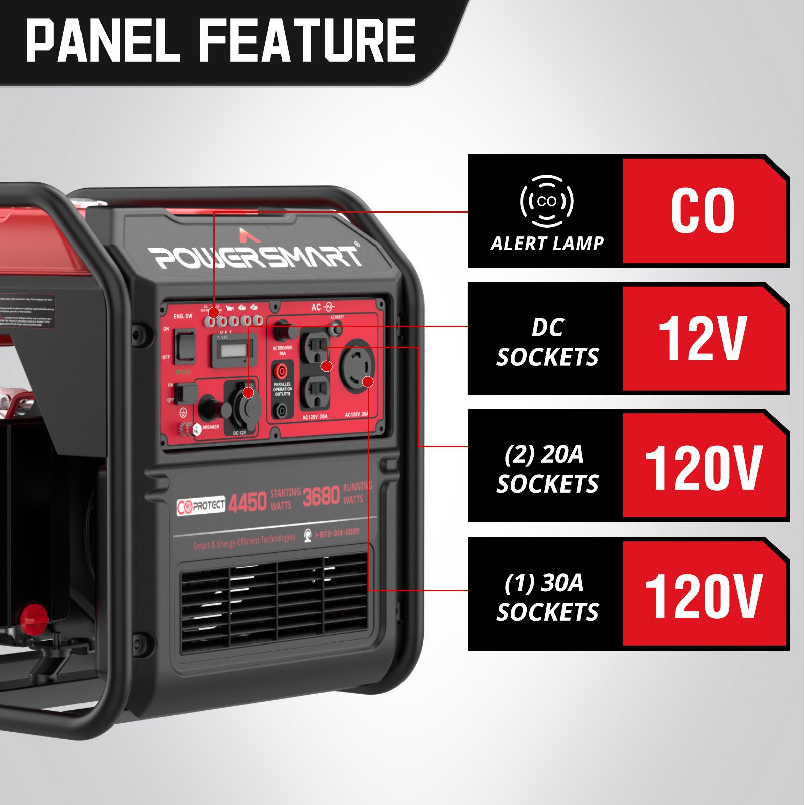 PowerSmart 4-stroke OHV engine gas generator, a reliable powerhouse generating 4450 peak watts and 3680 running watts. Ideal for various occasions, it operates at a maximum peak power noise level of 76 dbA, making it perfect for outdoor camping, RV preparation, and home backup. Boasting high fuel efficiency with a 2.7-gallon tank, it runs for up to 11 hours in economy mode. The digital display provides real-time information, while the generator offers clean power with multiple outlets. EPA certified and backed by a 3-year limited warranty, enjoy peace of mind with free lifetime technical support and 24-hour online service. Power up confidently!PowerSmart 4450-Watt RV Ready Open Frame Inverter GeneratorOutput power: 4-stroke OHV engine, 4450 peak watts/3680 running watts. Parallel system increases output power.Use occasions: 76 dbA maximum peak power operation, ideal for outdoor camping, RV preparation, home backup.High fuel efficiency: 2.7 gallon fuel tank, 11 hours of operation in economy mode, maximum fuel efficiency.Digital display: shows voltage, frequency, session run time and total run time.Clean power: 120V AC 30A RV ready outlet, 2x 120V AC 20A household outlets, 12V 8A DC outlet, clean output power less than 3% THD.
