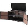 This garden bench box maximizes storage space and increases patio seating capacity while providing an attractive focal point to your garden or patio. It is made of sturdy steel; PE wicker; and weather-proof for durable use. When you lack space for storing your belongings outdoors; the box will work perfectly with a large capacity for storing your cushions; cleaning tools; and other items. There are two layers in the box to help you make full use of space. In addition; it is easy to store or take things because the box can be opened at the top or front. With concise design; it is ideal to place the storage box in your garden; patio; balcony; poolside; backyard; lawn; and other outdoor space in your house. Comes with detailed instructions; you can install the box quickly.