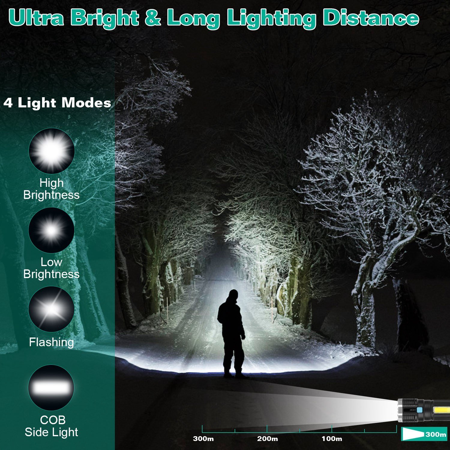 *Far-reaching Throw*:This rechargeable flashlight throws exceptionally bright light; which is visible even from 984ft away. The flashlight always delivers the highest possible light output without damaging the bulb; ideal for outdoor activities.